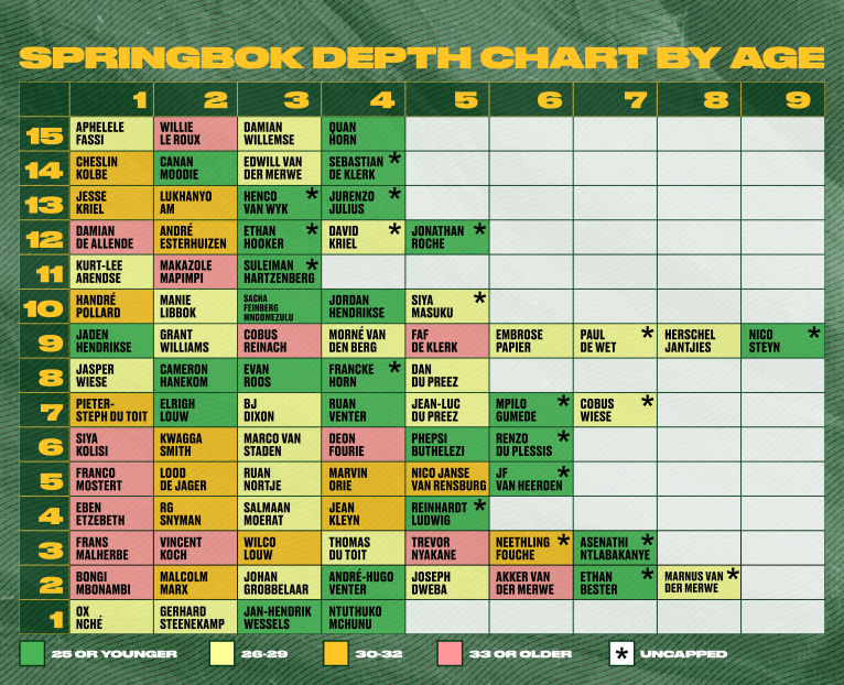 The topline is that the era of experimentation is far from over. We can expect more rotation over the next 13 matches and a lengthy list of players to rival the 50-strong contingent of 2024. More specifically, we can expect Erasmus to tinker with his combinations and explore his options across the various age profiles, in an attempt to strike the necessary balance between youth and experience. When one considers all the players who have been invited to the two alignment camps in March, according to their position in the depth chart as well as their age profile, some interesting patterns begin to emerge.