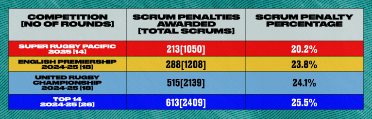 Super Rugby officials have tried their best to minimise the stoppages created by scrums in regular season play by calling ‘play on’ wherever possible. Take a look at the following table illustrating the percentage of penalties currently awarded in the top-tier club/provincial competitions around the world.